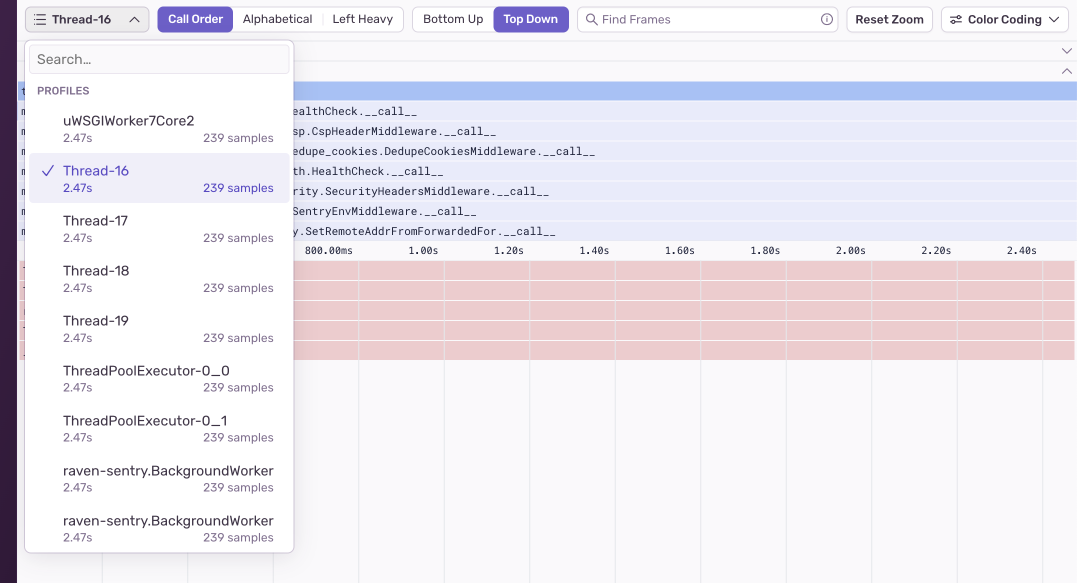 Profiling flame graph thread selector